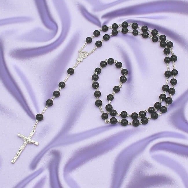 This lovely rosary is made with beautiful 8mm black glass pearls.