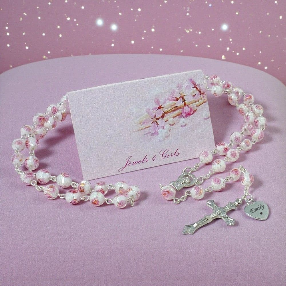 This high quality, handmade rosary is made up with 6mm handcrafted lampwork beads. Each bead has been fashioned from white and clear glass with a swirl of pink to represent a delicate rose and a flash of silver to add some sparkle.