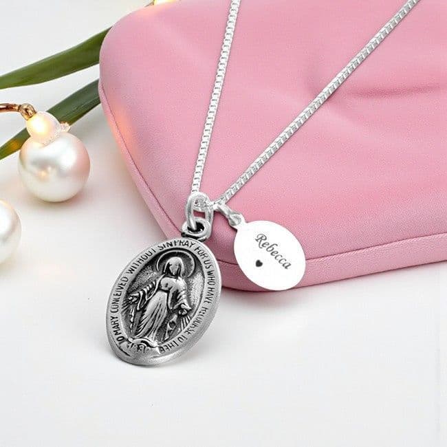 A beautiful, high quality necklace with a Miraculous medal pendant depicting Mary, offered with an optional personalised engraved message tag. Ideal gift for baptism, confirmation, first holy communion and many other occasions. All silver metal parts are real .925 sterling silver. Optional Sterling silver oval engraved tag by the pendant. Perfect for your own special words, names or dates.