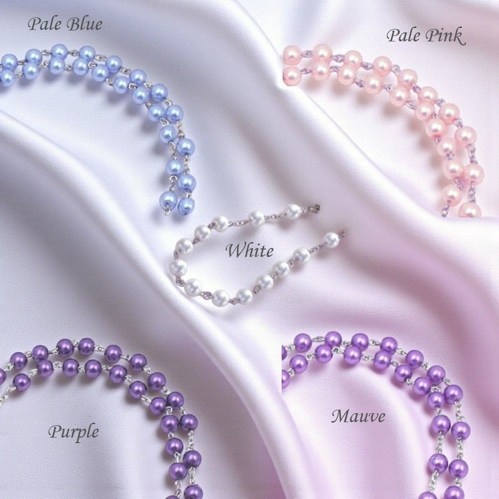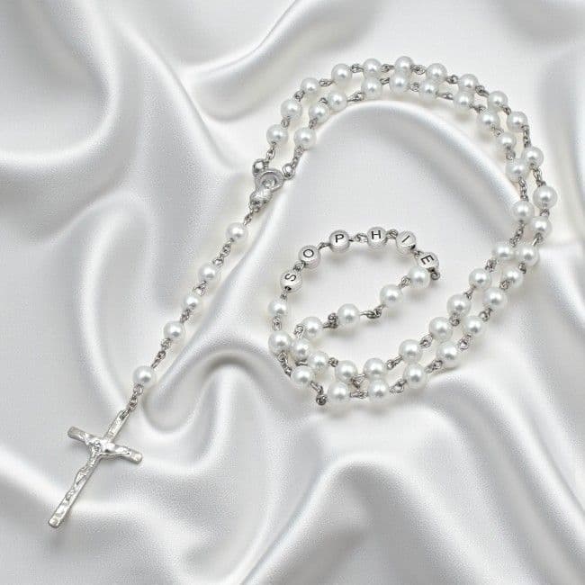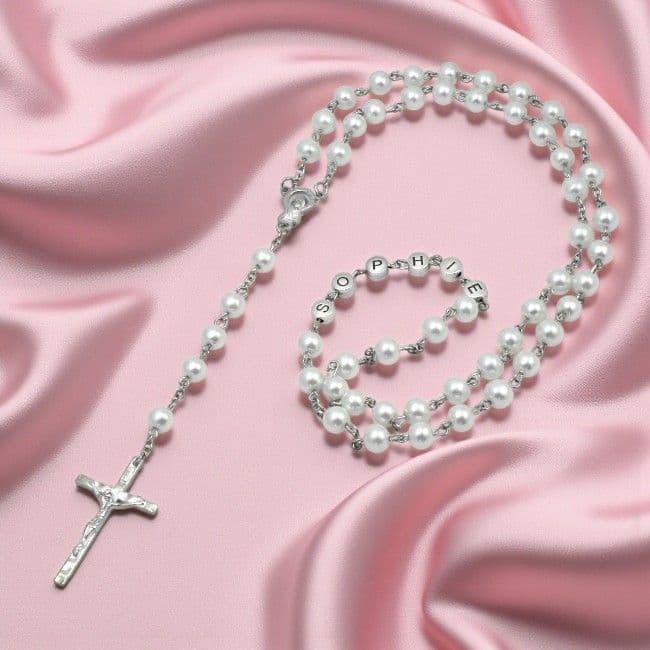 The rosary has been used and prayed by Catholics for centuries, these popular Pearl Rosary Beads will be personalised with Any Name (up to 10 letters) in Pewter Letters. This lovely rosary is made with beautiful 8mm glass pearls, a choice of colours are available.