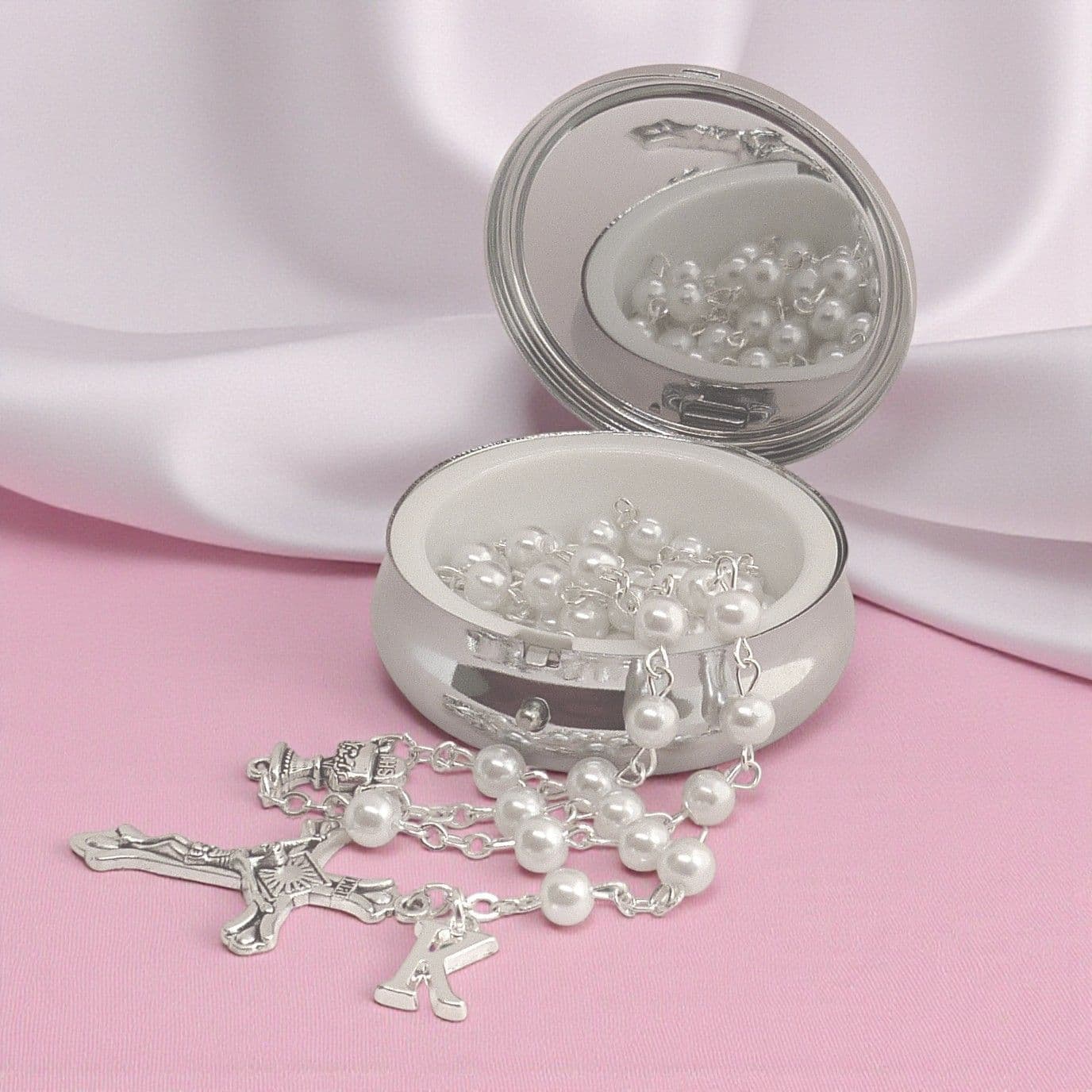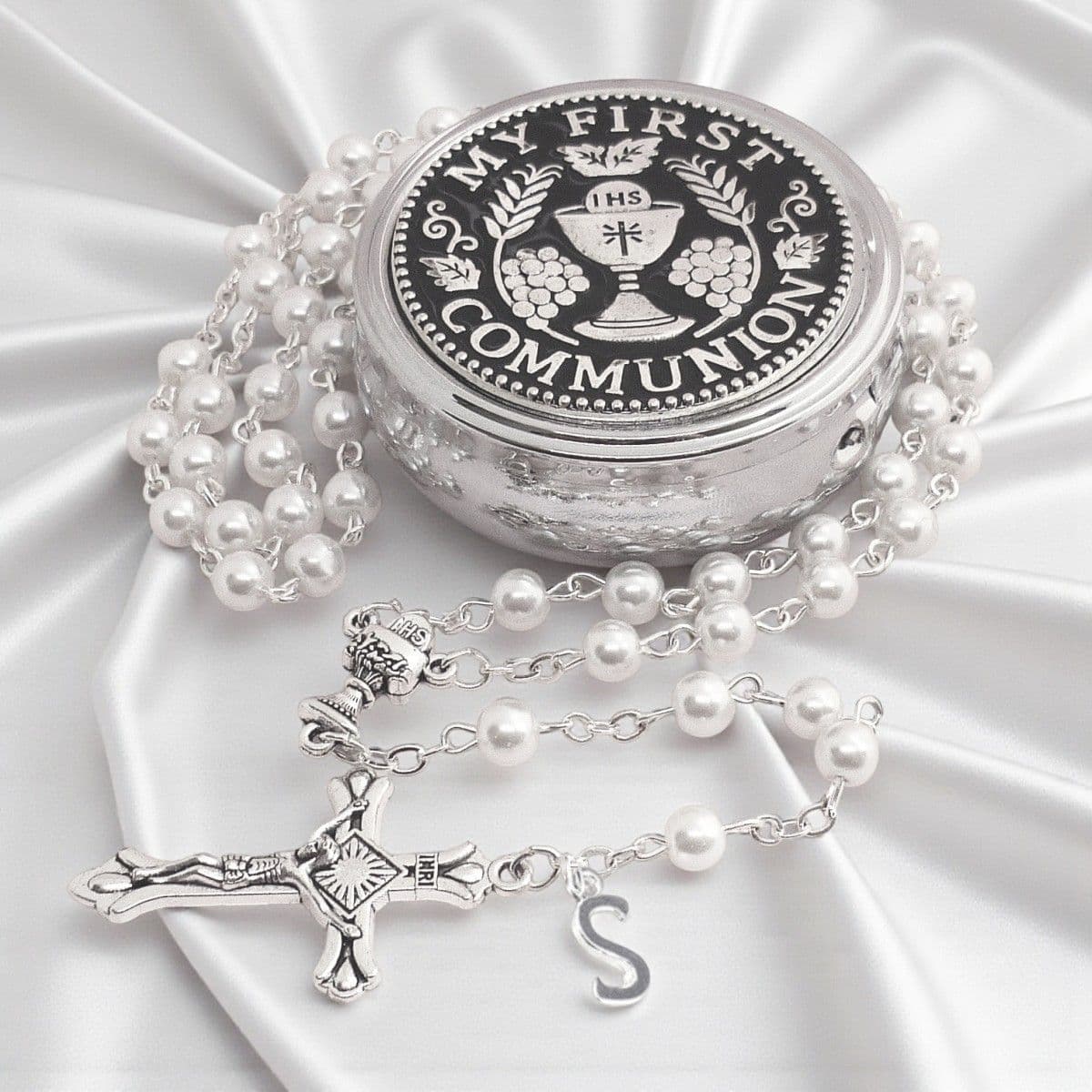 New this year! High quality, white glass pearl rosary beads (no plastic), presented in the gorgeous mirrored trinket pot with the words "My First Communion" on the lid.