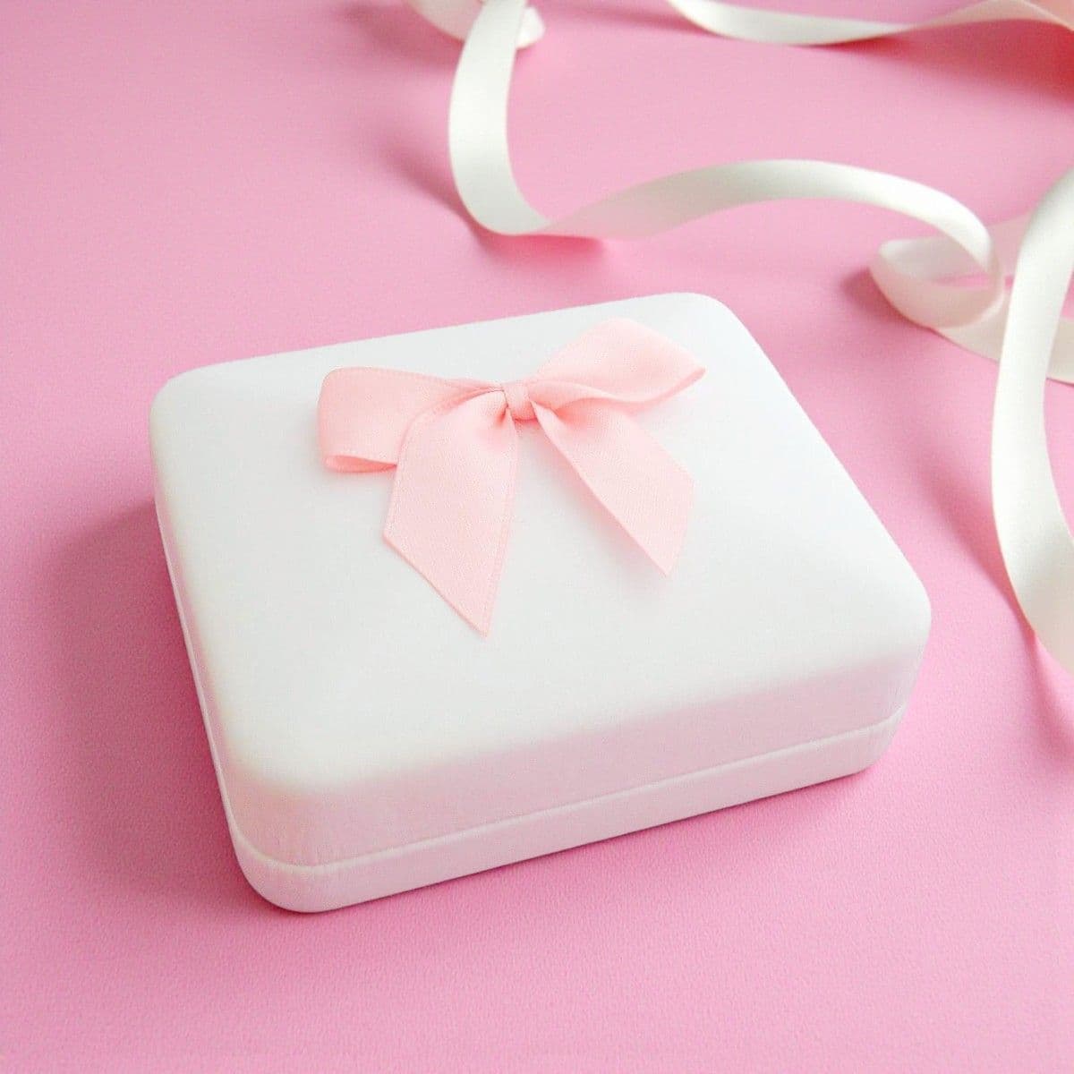 Gift Box: White leatherette box with a pale pink satin bow (other colours may be available on request) inside a protective outer sleeve which is also white.