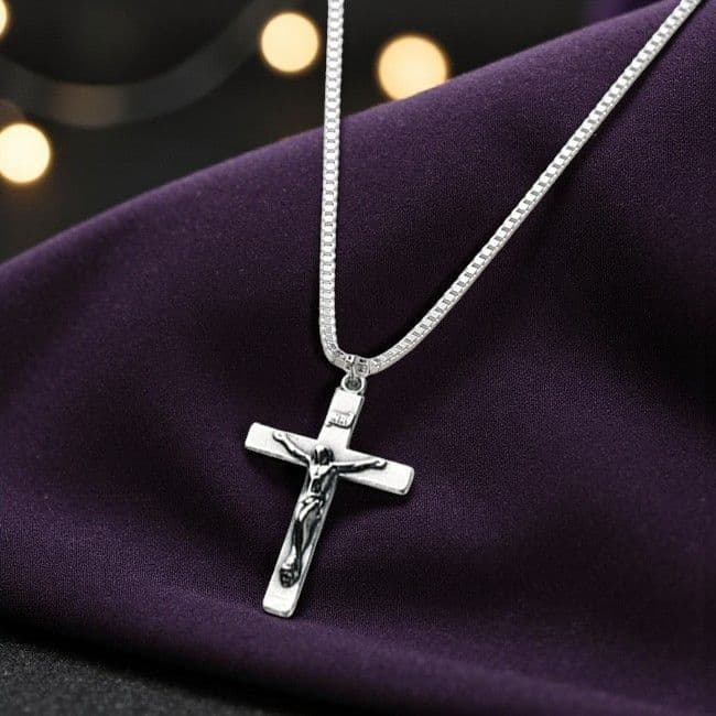 A charming Sterling silver Crucifix necklace, a very high quality necklace with all parts made from .925 Sterling silver. It is hallmarked stamped by the clasp. Presented in a deluxe gift box making a treasured gift for someone special.
